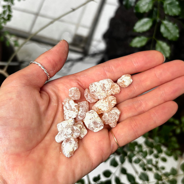 とても脆い樹脂で簡単に割れてしまいますが、割れた断面はガラスのきらめきのよう。息をのむほど美しい樹脂です。そしてもう一つ驚くべきことは、樹脂に鼻を近づけてもほとんど香りがしませんが、焚くと甘く優美で色っぽい香りが空間いっぱいに広がります。香りの雰囲気はインドのお香のようなイメージに近いでしょうか。