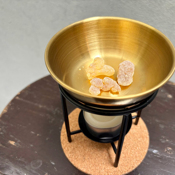 キャンドルの炎で樹脂を温めて香らせる、シンプルなデザインのキャンドルバーナー(¥2750 税込)です。炊き方が難しい樹脂もこれさえあればすぐに香りを楽しめます。ぜひセットでお試しください。