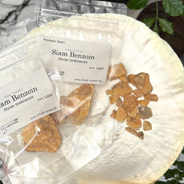 “安息香”とも言われ、アジアのお香では欠かせない素材のひとつとして知られる非常に有名な樹脂です。ベンゾインにはシャムベンゾインとスマトラベンゾイン(S. benzoin)がありますが、このシャムベンゾインは、甘いバニラ様の香りが強いのが特徴です。もともとタイで非常にたくさんの樹脂の採取が行われてきましたが、現在ではラオス産のものが主流となっており、昔から変わらず高価な樹脂の一つです。