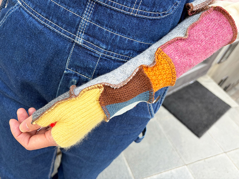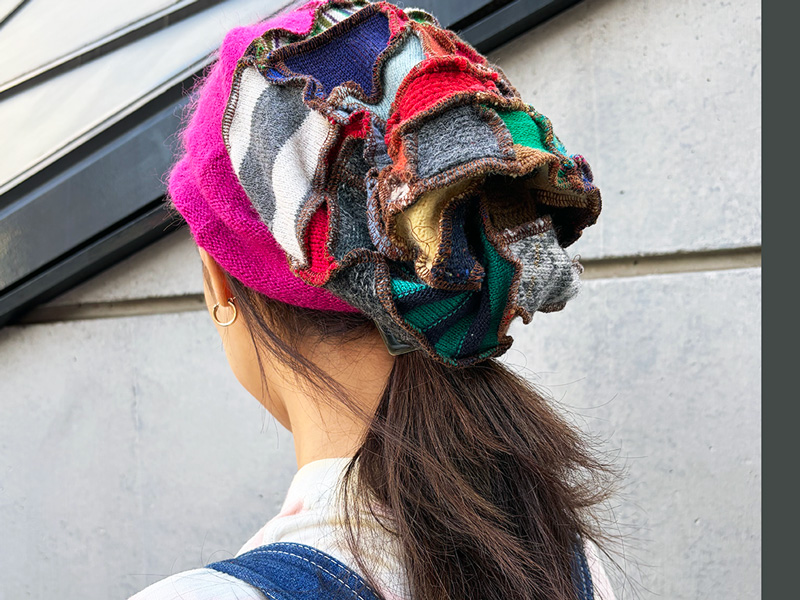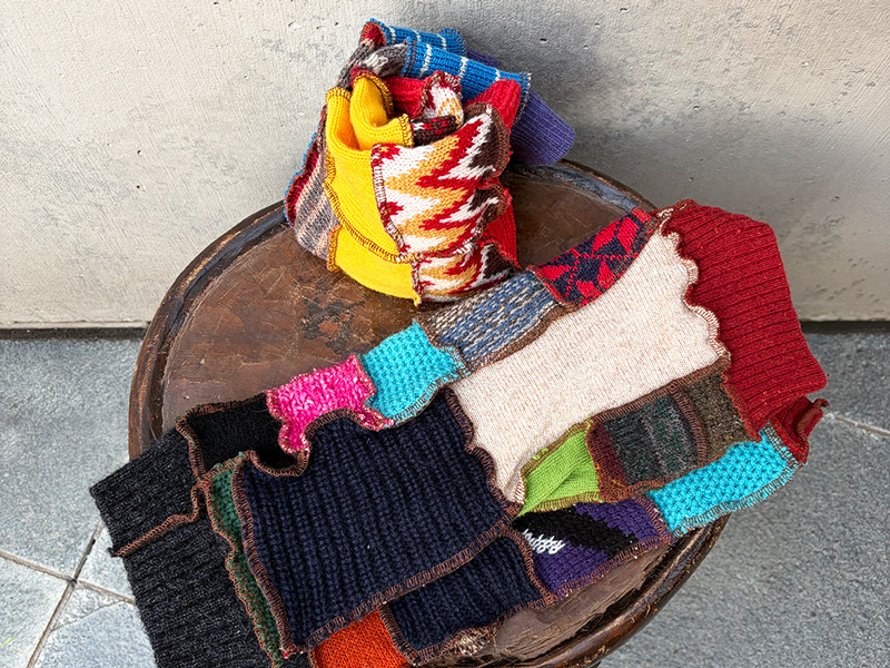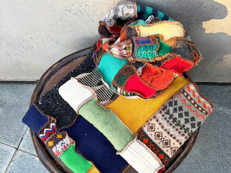 素材はシンプルに古着ニットのみに限定しつつ、仕上がりは再生流らしいカラフルな賑やかさにあふれています。